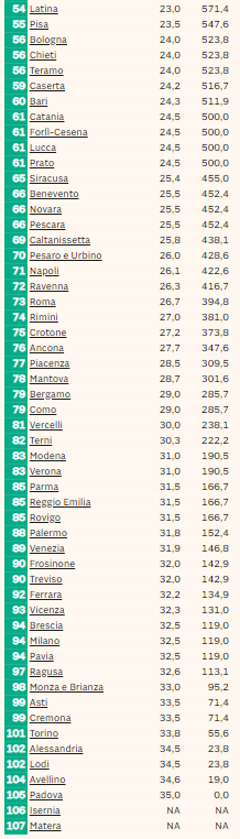 Tra il 100° e il 107° posto, gli ultimi in classifica, si evidenziano le seguenti città del Meridione: Messina, Trapani, Agrigento, Vibo Valentia, Enna, Foggia, Crotone e Caltanisetta.